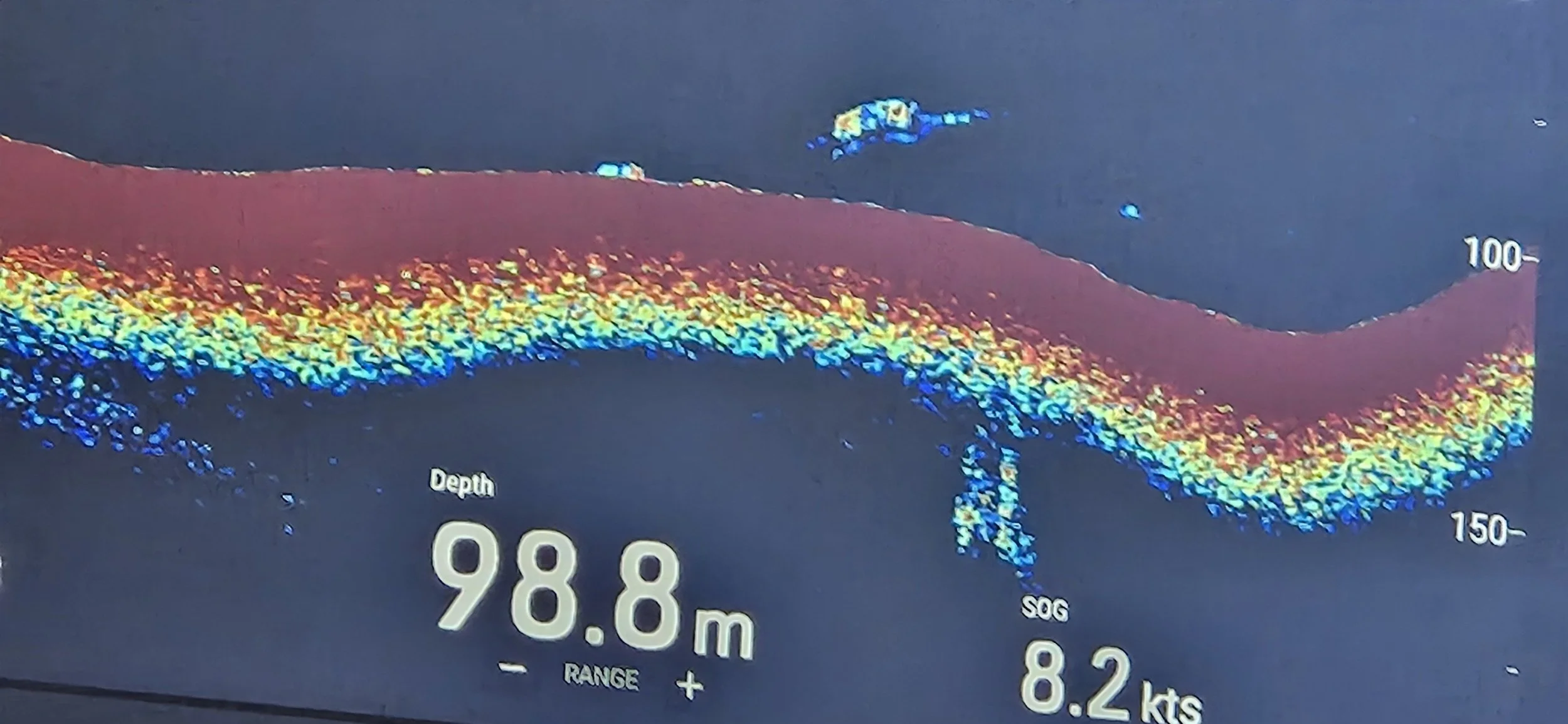 They actually have a screen displaying sonar of the water during the voyage. The crew member shared a screen shot of an image captured just last year that brought international media attention. Looks like something to me. Look just above the red band in the center of the picture.