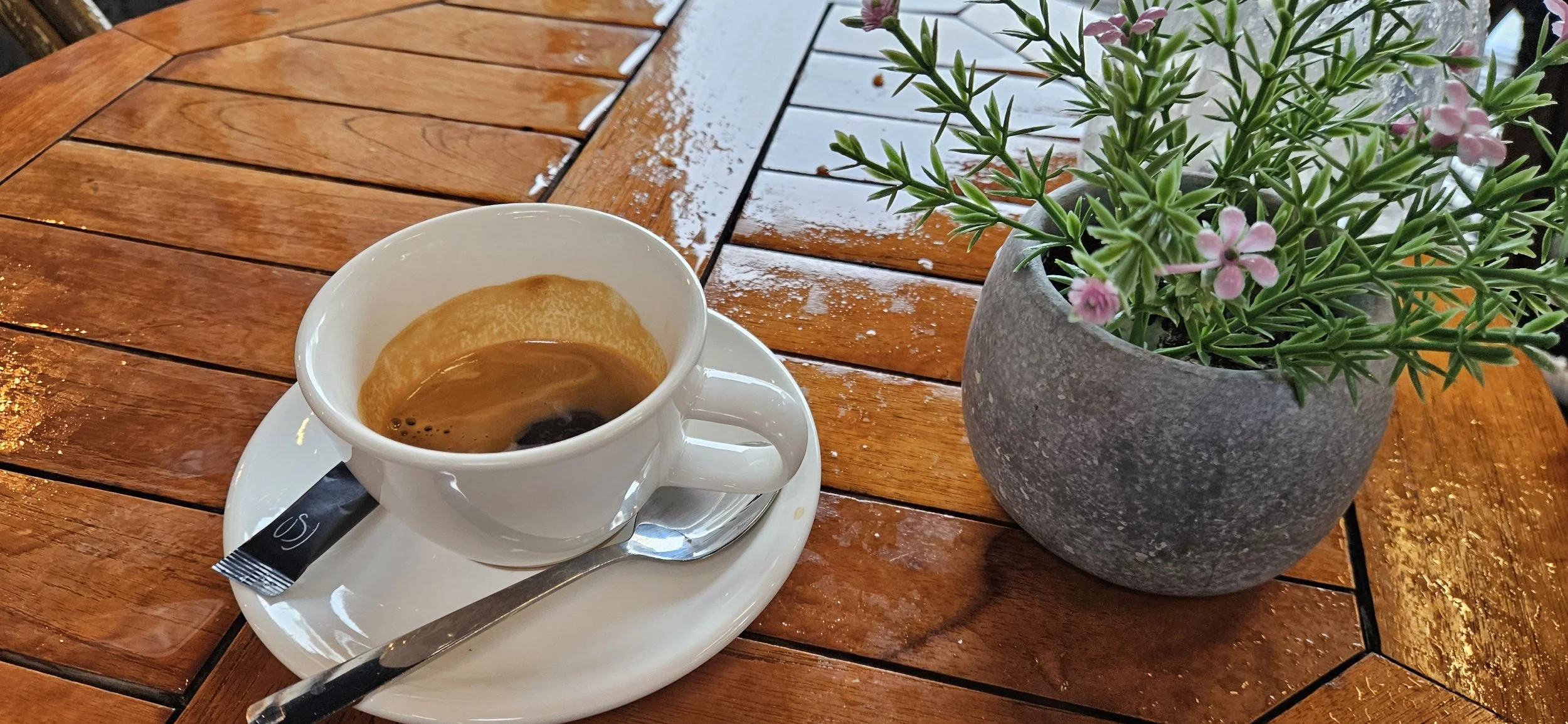 The rain I was trying to avoid at the track caught up to me. So, I took some shelter in a nearby coffee shop.