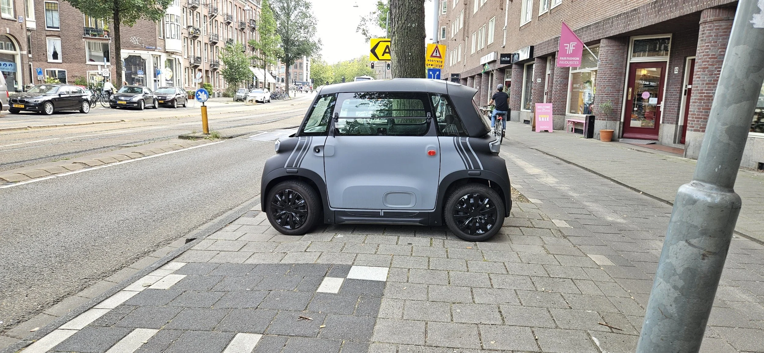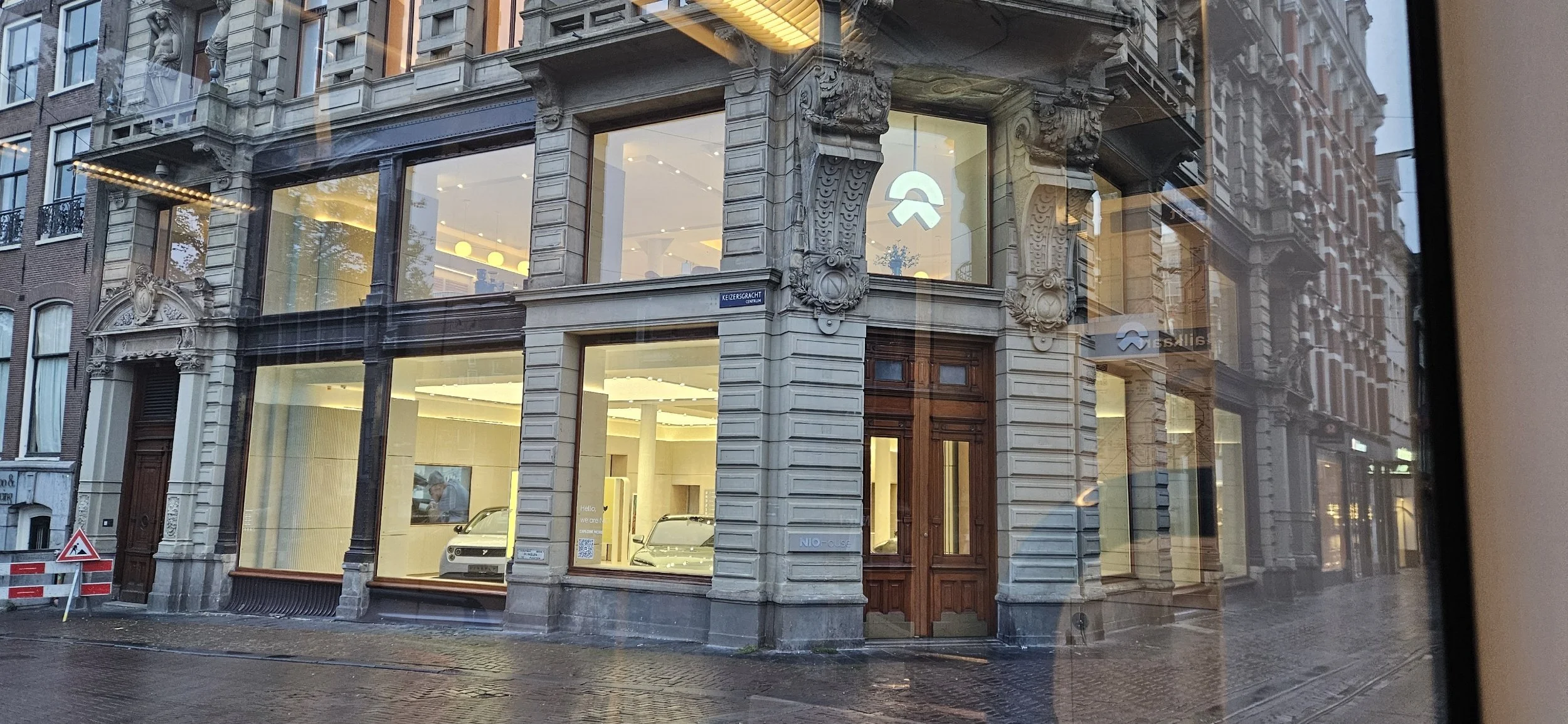 This appears to be a car dealership in the middle of old town Amsterdam. I don't recognize this make of vehicle. I belive it’s electric though.